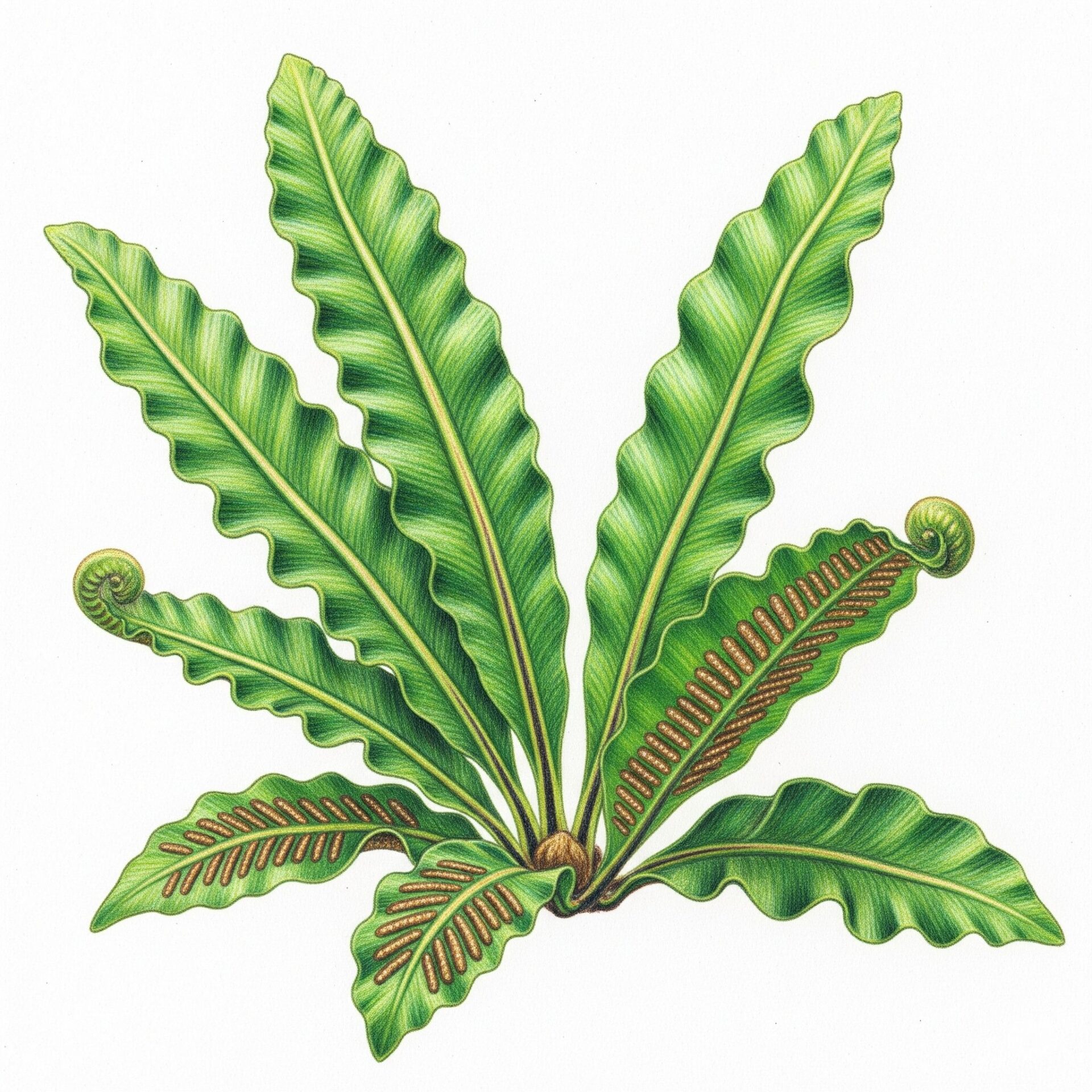 - Fronds: Unlike the feathery, divided fronds of most ferns, the Hart’s-tongue fern has long, undivided, strap-shaped fronds that are a glossy, deep green. The fronds can grow up to 60 cm long and have a wavy or undulating margin. This simple, tongue-like shape is what gives the plant its common name, as it was thought to resemble the tongue of a hart (an adult male deer).